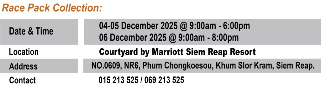 - レースキット受け取り時に大会委員会より IDパス が配布されます。このIDパスは 2025年12月4日~6日の期間、アンコール遺跡エリアへの無料入場(コース確認用)のみ可能ですが、遺跡内部の観光は不可です。